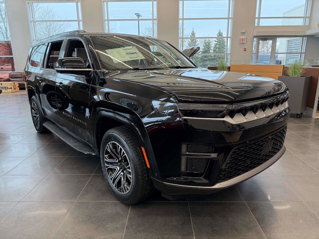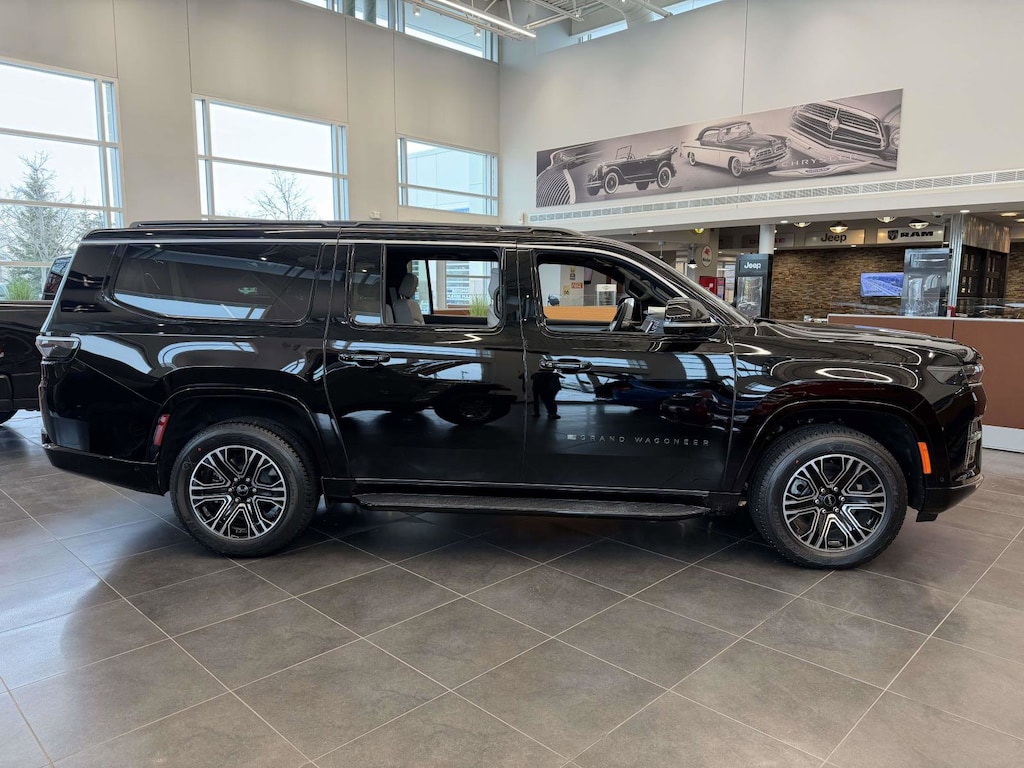SEA SALT/BLACK LEATHER TRIMMED BUCKET SEATS, MYFLEXCARE SERVICE PLAN, 7 600 LBS GVWR (STD), HIGH GLOSS BLACK, 8-SPEED AUTO 880RE TRANSMISSION (STD), PREMIUM GROUP I -inc: Side Distance Warning Luxury Front & Rear Floor Mats Reversible Carpet/Vinyl Cargo Mat Surround View Camera System Auto Power-Folding Mirrors P&P Park & Unpark Assist w/Stop System Auto-Power-Folding Exterior Mirrors Interior Rear Facing Camera 3 Panel Sunroof, 20" X 9.0" MACHINE FACE PAINTED ALUMINUM WHEELS (STD), QUICK ORDER PACKAGE 29E GRAND WAGONEER -inc: 3.0L I6 Hurricane SO Twin Turbo ESS Engine 8-Speed Auto 880RE Transmission, 3.0L I6 HURRICANE SO TWIN TURBO ESS ENGINE (STD), 3.55 REAR AXLE RATIO (STD), Turbocharged, Four Wheel Drive, Tow Hitch, Power Steering, ABS, 4-Wheel Disc Brakes, Brake Assist, Locking/Limited Slip Differential, Aluminum Wheels, Tires - Front Performance, Tires - Rear Performance, Conventional Spare Tire, Heated Mirrors, Integrated Turn Signal Mirrors, Power Mirror(s), Rear Defrost, Privacy Glass, Intermittent Wipers, Variable Speed Intermittent Wipers, Rain Sensing Wipers, Running Boards/Side Steps, Remote Trunk Release, Power Liftgate, Power Door Locks, Daytime Running Lights, Automatic Headlights, LED Headlights, Fog Lamps, Automatic Highbeams, AM/FM Stereo, Navigation System, Bluetooth Connection, Premium Sound System, Satellite Radio, MP3 Capability, Steering Wheel Audio Controls, Auxiliary Audio Input, HD Radio, Requires Subscription, Premium Sound System, Bluetooth Connection, Power Driver Seat, Power Passenger Seat, Driver Adjustable Lumbar, Seat Memory, Heated Front Seat(s), Cooled Front Seat(s), Power Driver Seat, Driver Adjustable Lumbar, Power Passenger Seat, Passenger Adjustable Lumbar, Bucket Seats, Rear Bucket Seats, Adjustable Steering Wheel, Trip Computer, Power Windows, WiFi Hotspot, 3rd Row Seat, Heated Steering Wheel, Keyless Entry, Power Door Locks, Keyless Start, Keyless Entry, Power Door Locks, Hands-Free Liftgate, Universal Garage Door Opener, Cruise Control, Adaptive Cruise Control, Climate Control, Multi-Zone A/C, A/C, A/C, Rear A/C, Leather Seats, Bucket Seats, Auto-Dimming Rearview Mirror, Driver Vanity Mirror, Passenger Vanity Mirror, Driver Illuminated Vanity Mirror, Passenger Illuminated Visor Mirror, Floor Mats, Seat Memory, Remote Engine Start, Keyless Start, Remote Engine Start, Smart Device Integration, Requires Subscription, Navigation System, Smart Device Integration, Mirror Memory, Power Windows, Power Door Locks, Trip Computer, Security System, Immobilizer, Cruise Control Steering Assist, Traction Control, Stability Control, Traction Control, Front Side Air Bag, Telematics, Requires Subscription, Rear Parking Aid, Blind Spot Monitor, Cross-Traffic Alert, Rear Collision Mitigation, Cross-Traffic Alert, Lane Departure Warning, Lane Keeping Assist, Lane Departure Warning, Front Collision Mitigation, Driver Monitoring, Tire Pressure Monitor, Driver Air Bag, Passenger Air Bag, Front Head Air Bag, Rear Head Air Bag, Passenger Air Bag Sensor, Knee Air Bag, Child Safety Locks, Back-Up Camera